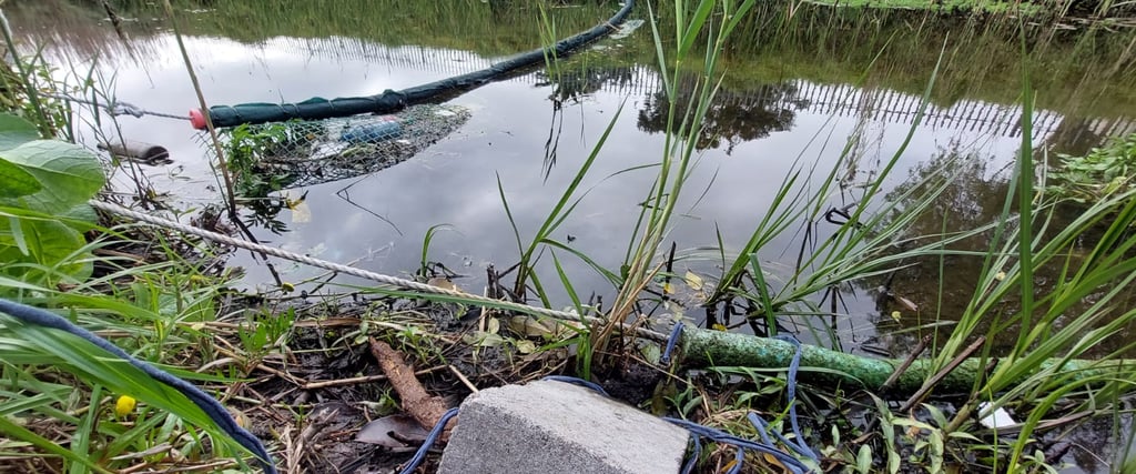 The litterboom was constructed with rope, pool noodles and wrapped in fabric to strengthen and secure the pool noodle foam. Beneath the surface some fencing was attached to help prevent heavier objects from being pulled under the litterboom, while still allowing space for any wildlife to move.